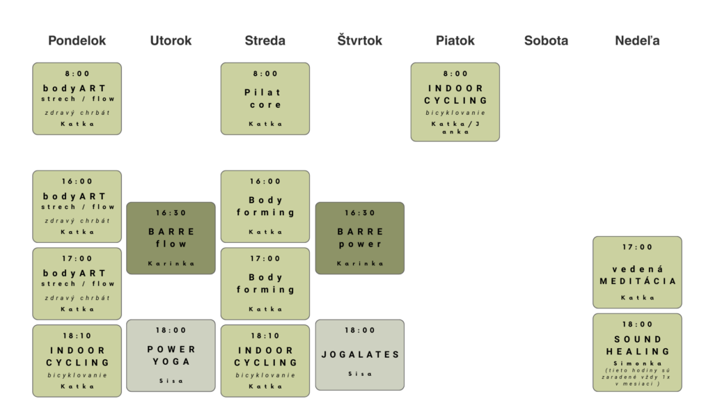Ak si nie ste istá, ktorá hodina pre Vás bude tá najvhodnejšia, pozrite si "Popis cvičení", alebo nás neváhajte kontaktovať!